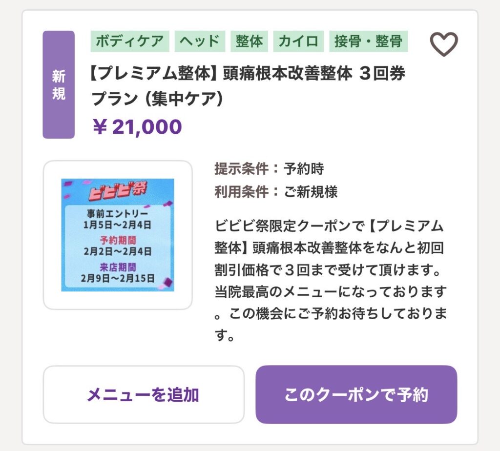 ビビビ祭限定クーポンで【プレミアム整体】頭痛根本改善整体をなんと初回割引価格で3回まで受けて頂けます。当院最高のメニューになっております。この機会にご予約お待ちしております。